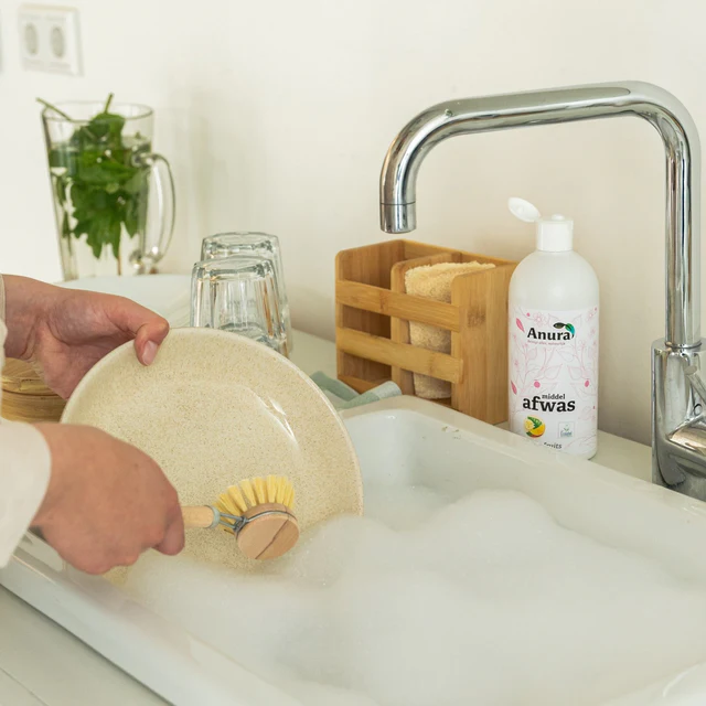 Een scheutje van ons afwasmiddel is genoeg voor een fris en fruitig sopje en een stralend schone vaat. Gemaakt van plantaardige ingrediënten om al je pannen, borden, glazen en bestek eenvoudig schoon te maken. En dankzij de toevoeging van duurzame glycerine is ons afwasmiddel ook nog eens extra vriendelijk en zacht voor je handen.