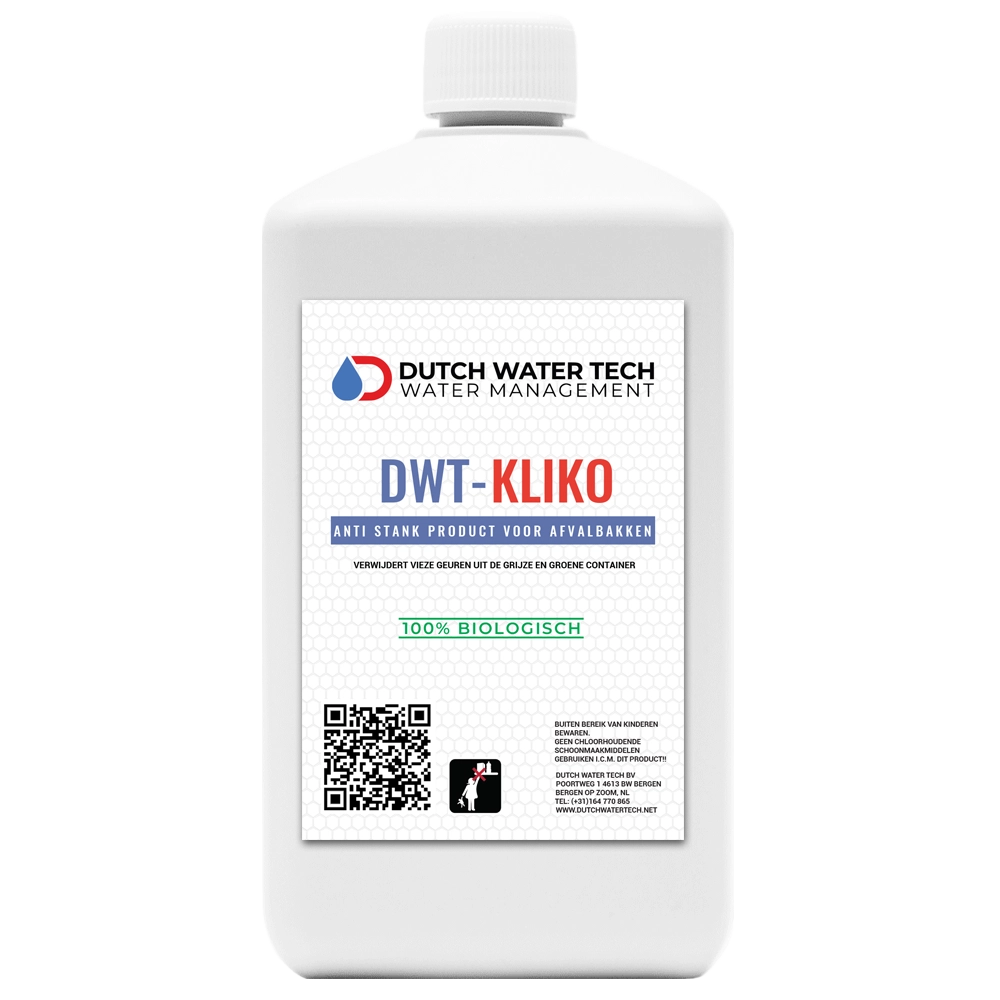 DWT-Kliko is speciaal ontwikkeld door Dutch Water Tech om vieze geuren uit de grijze en groene container te verwijderen. Het is een 100% biologisch anti-stank product voor afvalbakken.