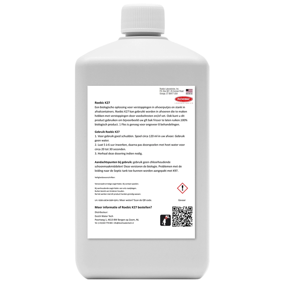 Dutch Water Tech levert betrouwbare en effectieve producten. Heb Roebic K27 gebruikt tegen stank uit de vuilnisbak. Kwart flesje erin, 5 uurtjes laten intrekken, vervolgens uitspoelen en ik was van de stank af! Top product!