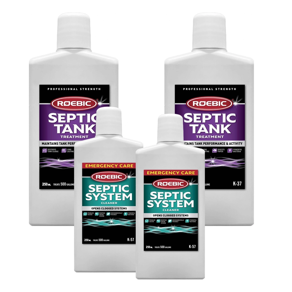 Septic Tank EHBO Kit is speciaal bedoeld voor huishoudens die last hebben van ernstige verstoppingen van de septic tank en deze opnieuw willen opstarten. Het bevat twee 100% biologische producten: Roebic K57 en K37.